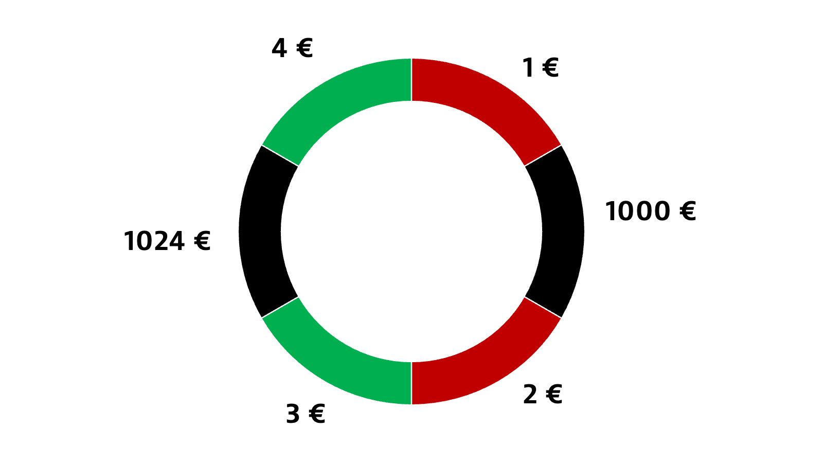 You can label the 6 sectors as red, black, red, green, black, green (in this order, starting with sector 1). In this way, you gain 1000 + 1024 euros and lose 1 + 2 euros, for a total net gain of 2021 euros.