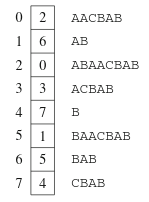 Esimerkiksi merkkijonon ABAACBAB suffiksitaulukko on [2,6,0,3,7,1,5,4]. Seuraava kuva näyttää, miten suffiksitaulukko vastaa merkkijonon suffikseja: