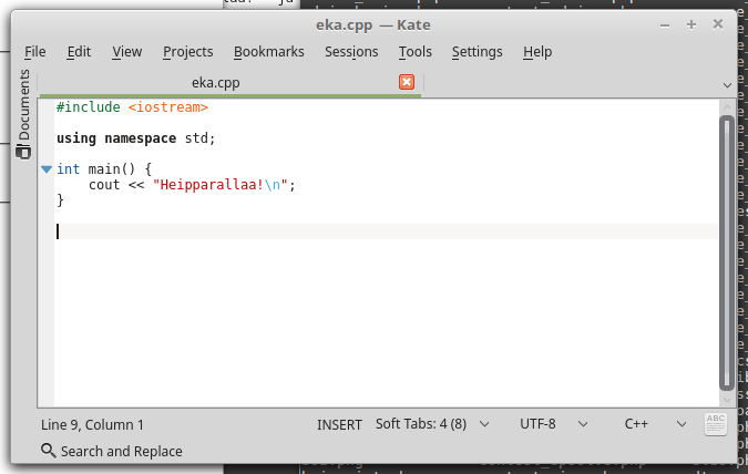 Kate on helppokäyttöinen editori, jossa on C++-koodin väritys. Seuraavassa kuvassa on kirjoitettu ja tallennettu ohjelma "eka.cpp":